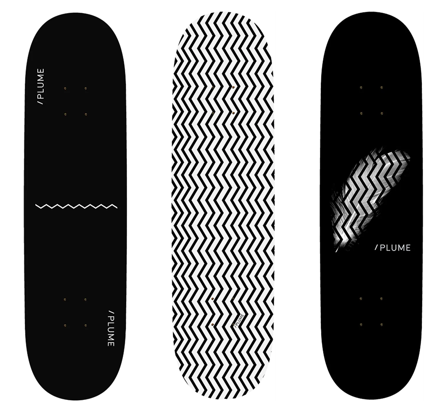 Plume Skateboards began in 2017 as an internal creative project – an opportunity to rethink skate identity through a minimalist lens. The brand was developed from scratch, from naming and logo design to board graphics, apparel and supporting materials, using simple forms and a refined visual language.